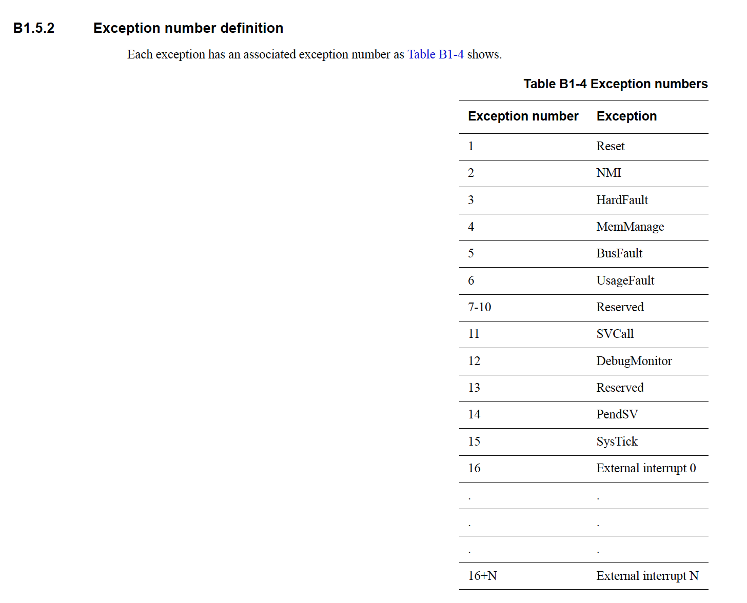 first exception numbers (corresponding to Reset, NMI, and Hardfault, respectively) do not have a