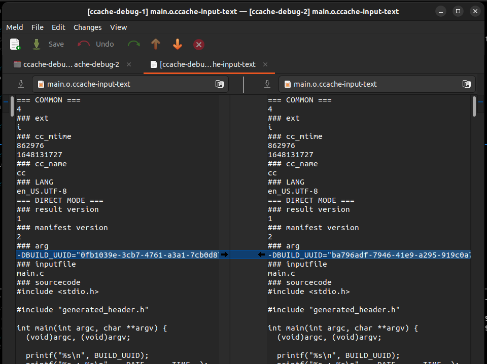 From this, we can see that there’s a compiler argument, -DBUILD_UUID, that changed from the first build to the second, and caused the cache miss.