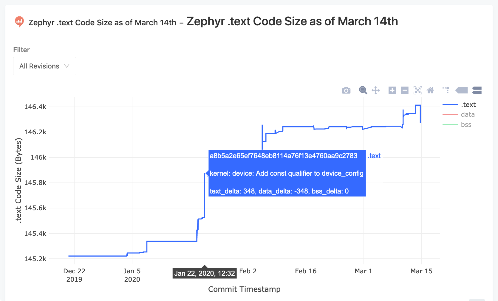 In the remainder of this blog post, we will set up a code size tracking dashboard for the popular open-source RTOS, Zephyr1. We also want to take this data and be able to compute the code size deltas between commits to know exactly which commits and by how much each one contributed to the code size.