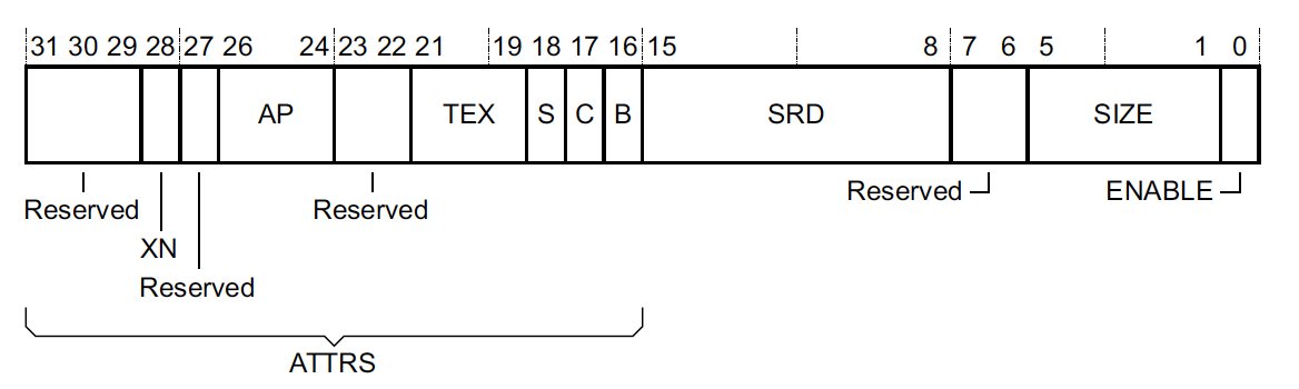 This is the register where nearly all of the MPU configuration magic actually happens. The ENABLE bit controls whether or not the region is active (when the MPU itself has been enabled by setting the ENABLE bit in MPU_CTRL).