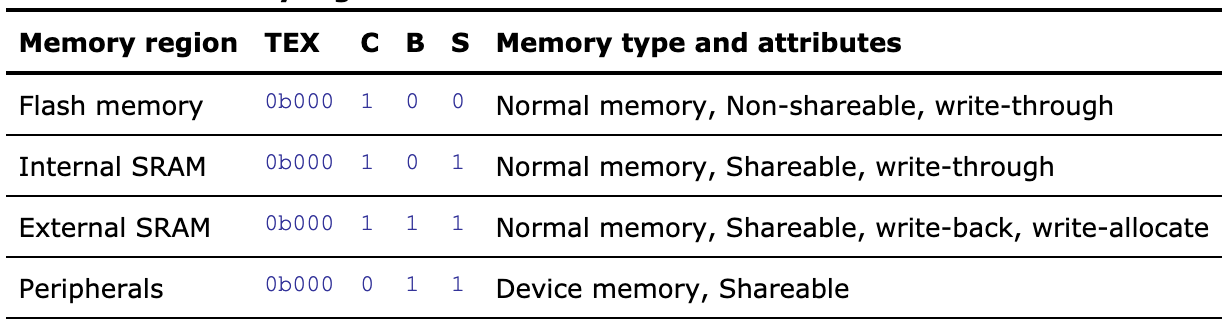 This config is comprised of the TEX (Type Extension Mask), C (Cacheable), B (Bufferable), & S (Shareable) fields. More details about each memory attribute can be found in the Summary of ARMv7 memory attributes of the ARMv7-M reference manual. Typically, these settings do not matter much for a single core Cortex-M implementation. I usually follow the recommendations in the table below from here: