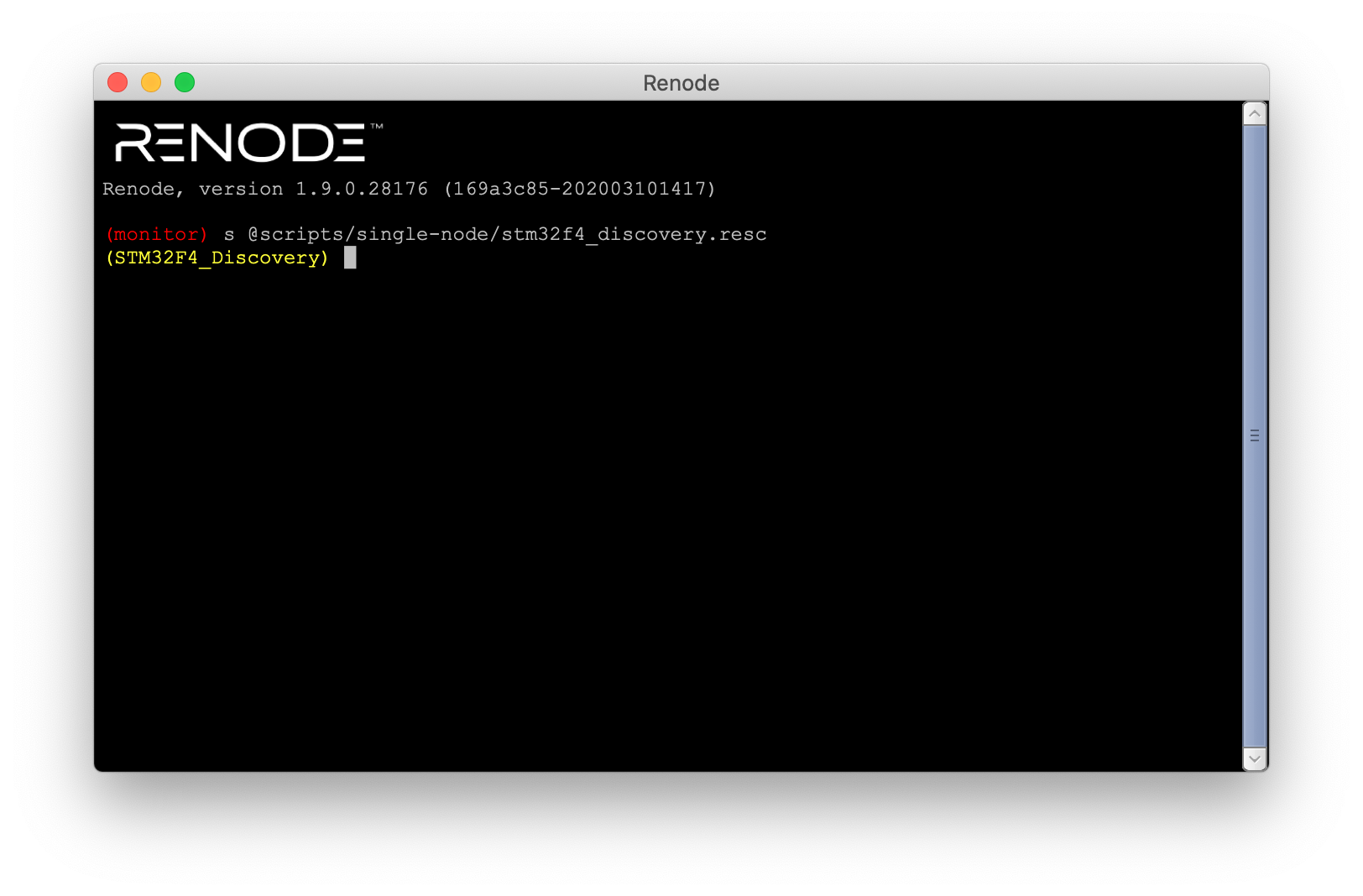 $ sh /Applications/Renode.app/Contents/MacOS/macos_run.command - A Renode terminal window will open. Load the example with