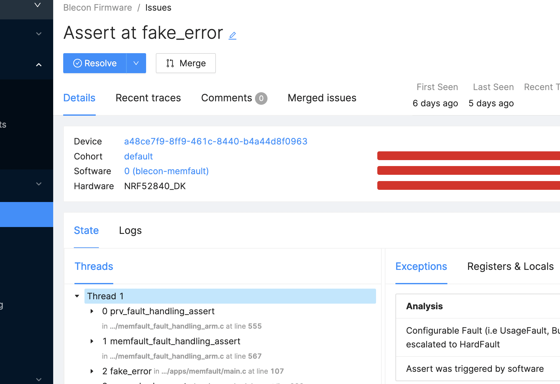 Now, when we generate an error on the device we see a proper stack trace in Memfault: