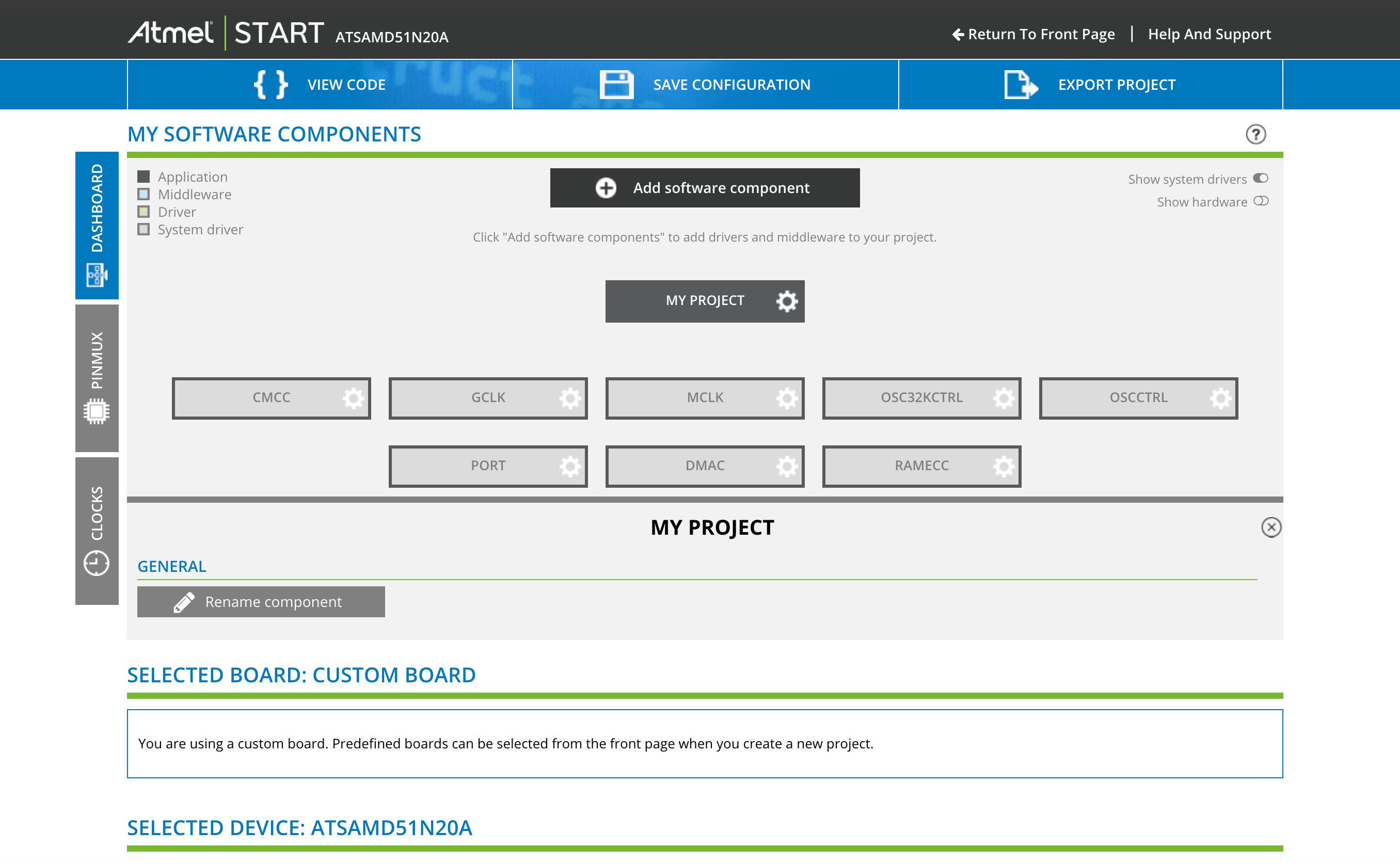 Recently acquired by Microchip, Atmel has been making SAM-family MCUs for a long time. The SAMD21 is well-liked in hobbyist circles and is featured in several Arduino and Adafruit designs. Atmel’s peripheral library, AXF, went through a similar transformation to ST’s: it went from a single zip archive to a configurator.