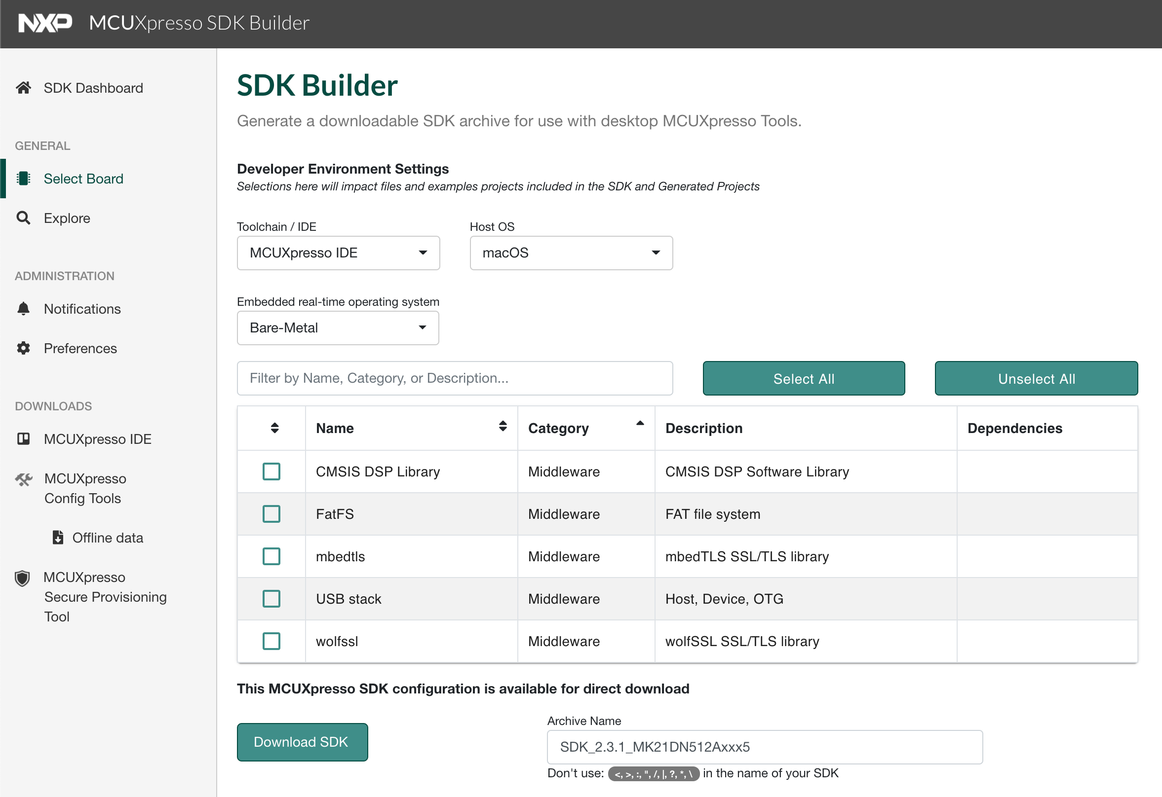 I found the online MCUXpresso SDK builder a breeze to use. It is snappy, straightforward, and it keeps track of all your previously configured SDKs. Great job, NXP! The only downside of the tool is that it requires you to register on their website.
